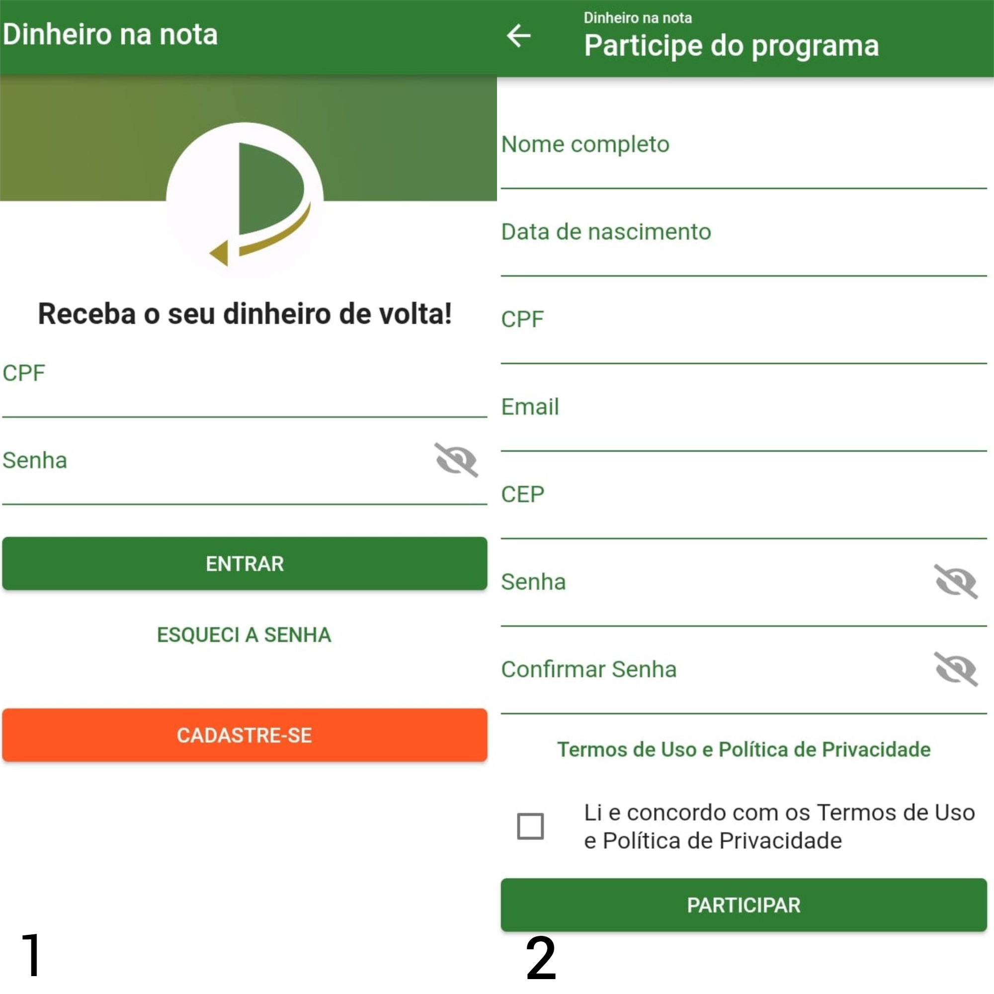 Para cadastrar é um processo muito simples e após baixar o aplicativo, você deve clicar em “cadastre-se”, adicionando as suas informações pessoais tais como: Nome completo, data de nascimento, CPF, e-mail, CEP e senha. Leia e concorde com os termos de uso e política de privacidade e clique em “participar”.